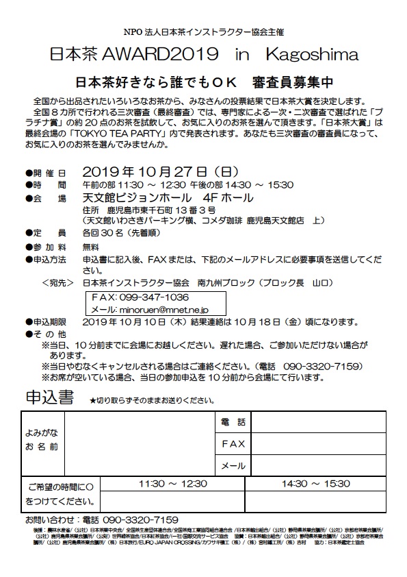 Nihoncha AWARD2019 Kagoshima is held on October 27th in Tenmonkan Vision Hall 4F, Kagoshima-city.